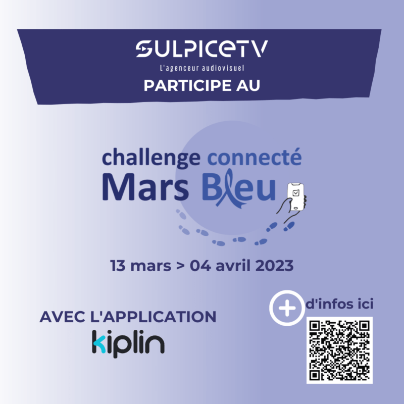 Pour sensibiliser davantage à ce sujet, SULPICE TV participe au challenge connecté Mars Bleu, un défi sportif de 3 semaines organisé par Dépistage des cancers Auvergne Rhône Alpes – CRCDC AuRA , avec l’application Kiplin en entrant le code CRCDC23AURA.