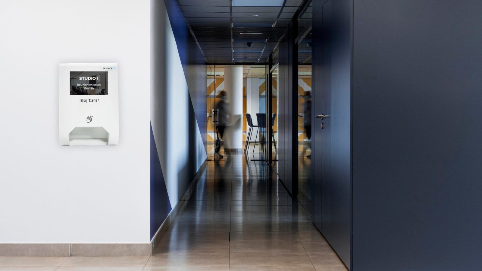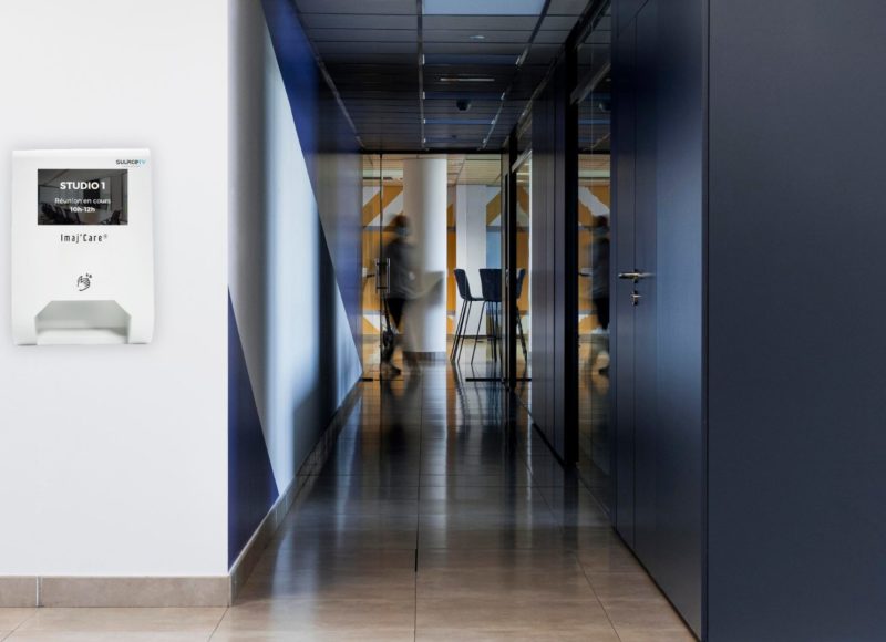 Il est à la fois un écran permettant l’affichage dynamique d’informations adaptées selon le lieu et le profil de vos visiteurs, et pouvant être administré en temps réel et à distance, puis un distributeur automatique de gel hydroalcoolique.