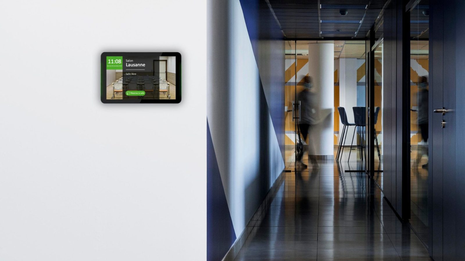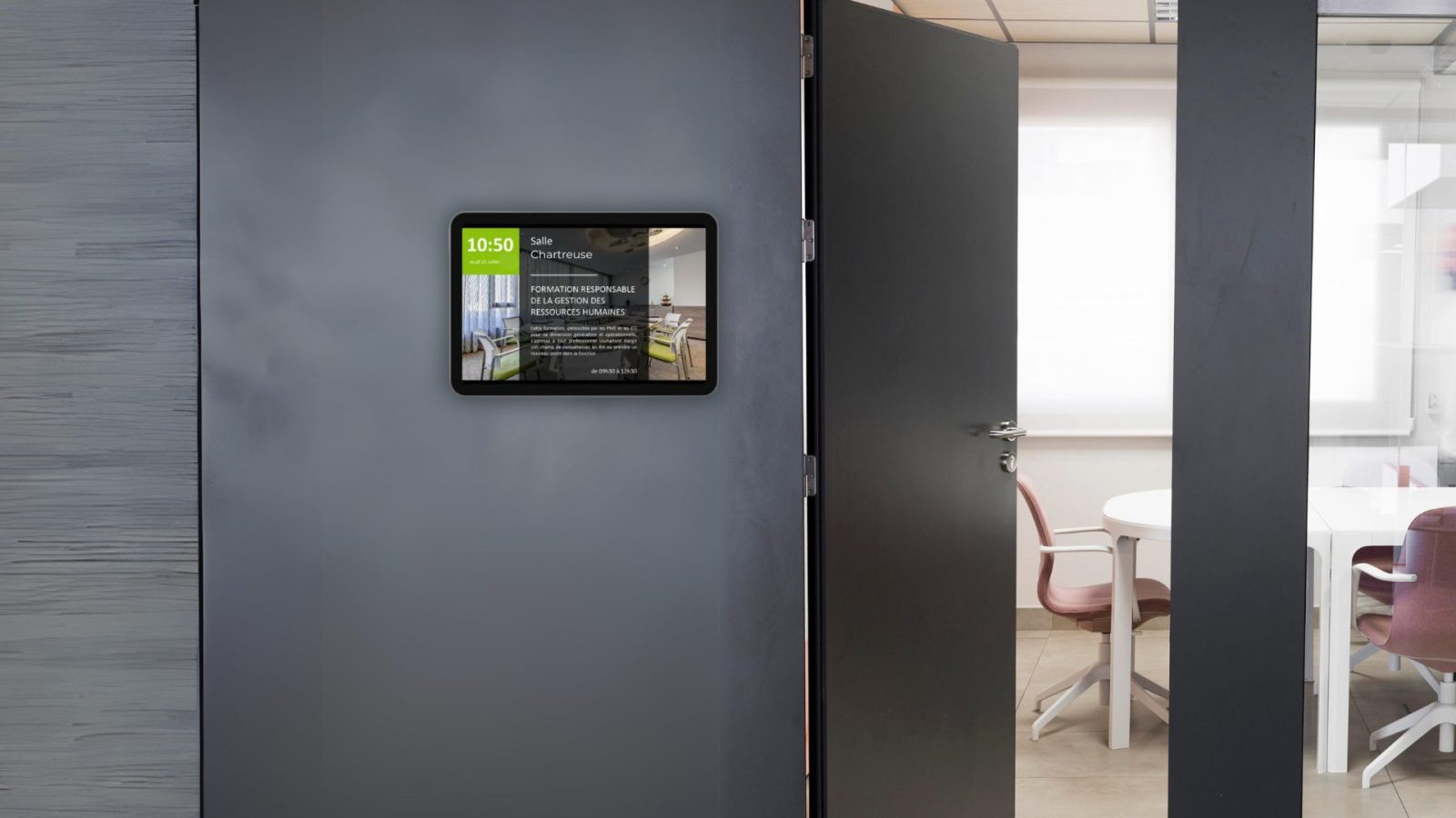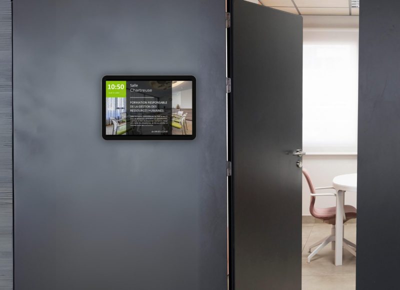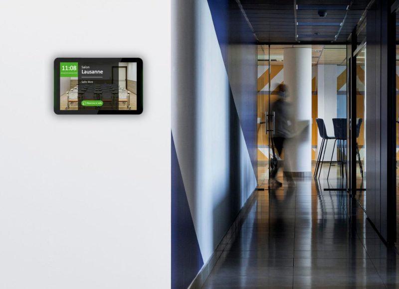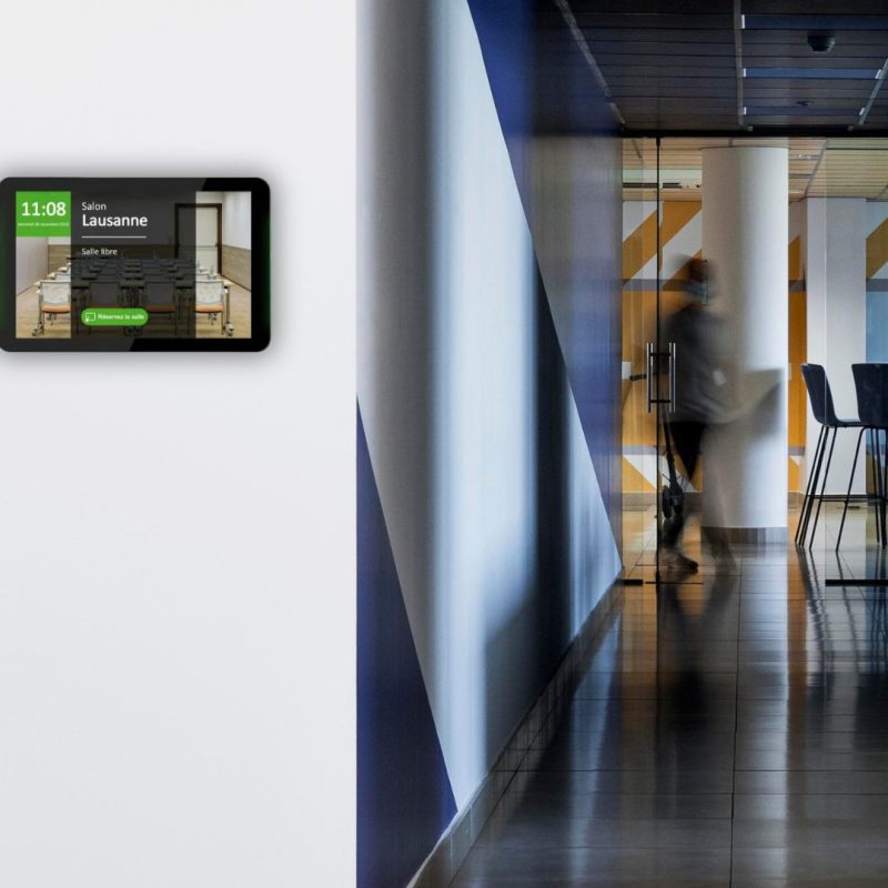 La solution Room Booking intègre des écrans connectés placés devant chaque salle, offrant une interface claire et intuitive :