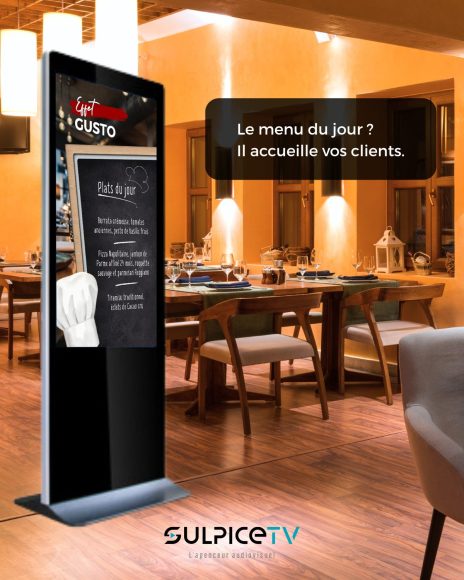 Avec notre totem d’affichage dynamique, affichez votre menu du jour directement à l’entrée, de façon claire, moderne et élégante.